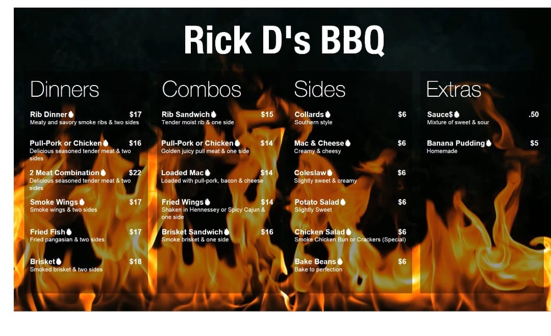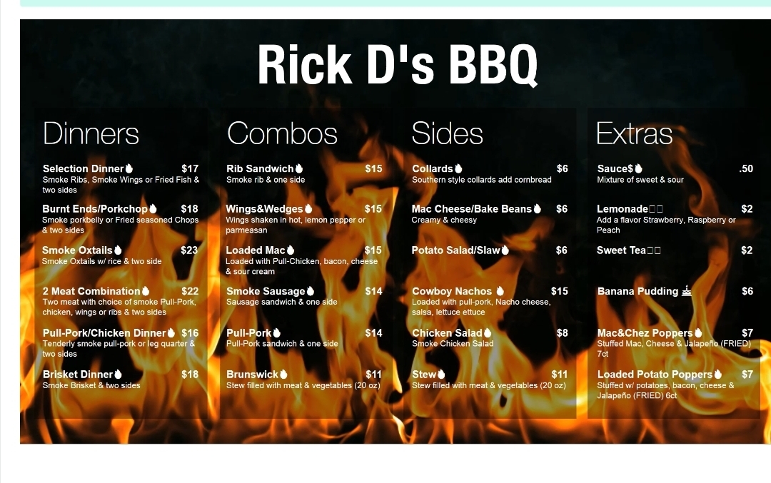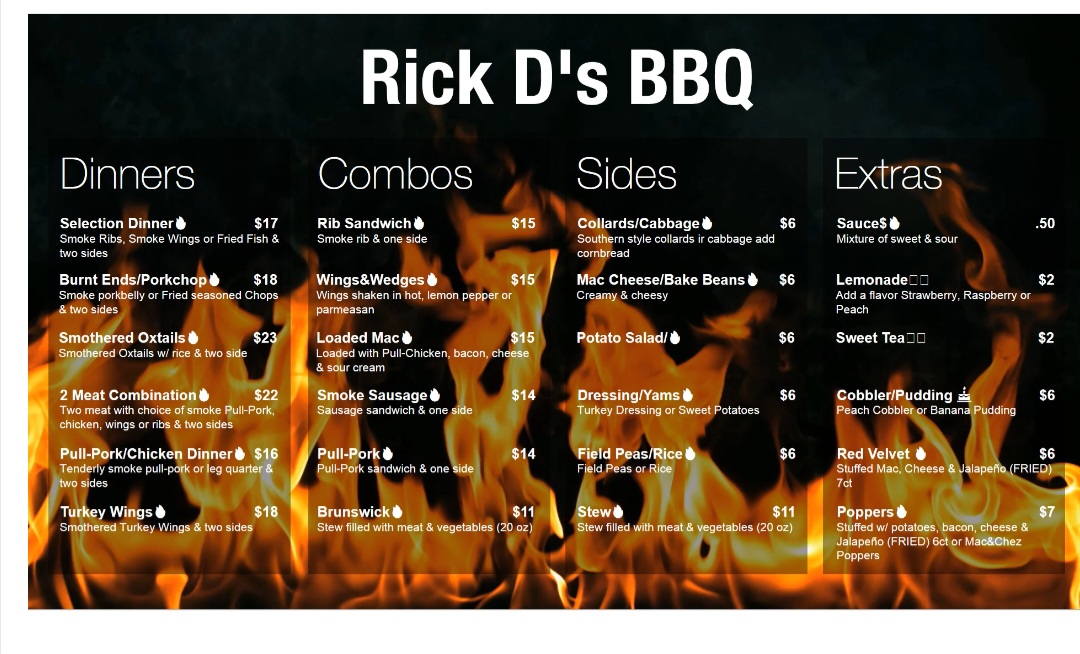 Nestled in the heart of Bonaire, GA, Rick D's BBQ & More offers a culinary experience that is bound to make your taste buds sing. Located at 198 Old Perry Rd, this hidden gem invites you to embark on a flavor-packed adventure with its diverse menu crafted to satisfy every craving. From the tender, smoky perfection of our Pulled Pork and Brisket to the irresistibly crispy Fried Pork Chops, each dish is a testament to Southern comfort food at its finest. Don't miss out on our Smothered Oxtails and two sides or the classic favorite, Ribs Chicken Mac N Cheese. For something a bit more unique, our Pizza surprises with a barbecue twist that's both satisfying and indulgent. Pair these with a side of Collard Greens or Cole Slaw for the perfect bite. And no meal is complete without a sweet finish—our homemade Cobbler is a must-try. Whether you're a meat lover or a veggie enthusiast, as our Veggie Dinner will attest, Rick D's BBQ & More has something delicious waiting just for you. So why wait? Swing by and taste what everyone in Bonaire is talking about!